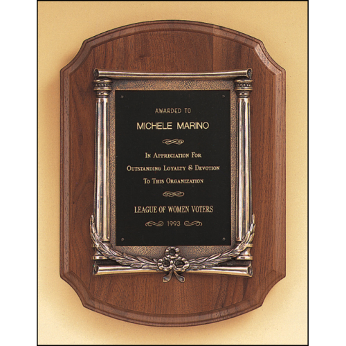 Solid American walnut plaque with an antique bronze casting and your choice of 2 activity insert. Laser engravable plate(s). Solid brass engraving plate(s). Individually boxed. Casting design U.S. Pat. No. D307,520