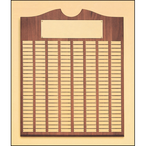 Americas most popular line of perpetual plaques, appropriate for donor and alumni walls. Solid American walnut plaque with traditional scalloped design top. A wide choice of plate combinations to suit almost any purpose. Brushed brass plate(s). Individual plates are 7/8 x 2-3/4. Made in USA. Custom multi-plate plaques available. Call for quote information.
