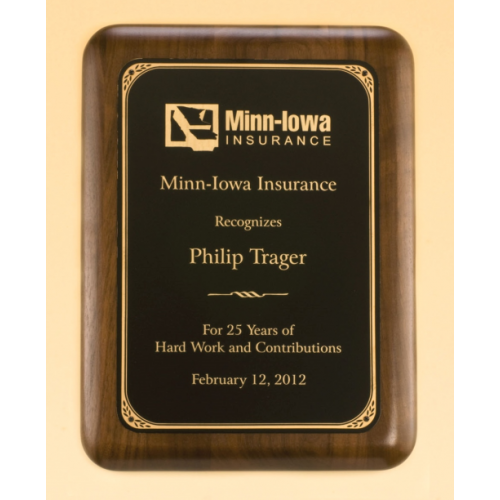 The original and still the best plaque in America. Solid American walnut plaque with a precision elliptical edge and a black or brushed brass plate with printed border. Black brass plates are laser engravable plate(s). Solid brass engraving plate(s). Individually boxed. Made in USA.