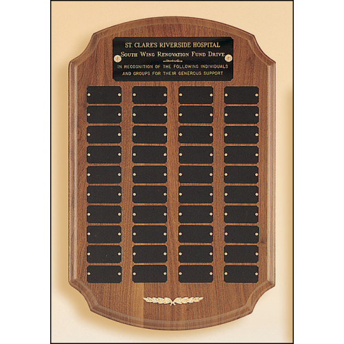 Solid American walnut perpetual plaque with 40 black brass plates. Solid brass engraving plate(s). Custom multi-plate plaques available. Call for quote information.
