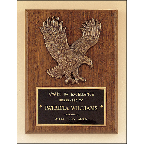 Eagle Award, recognize excellence. Solid American walnut plaque and sculptured metal eagle relief casting with antique bronze finish. Laser engravable plate(s). Solid brass engraving plate(s). Individually boxed.