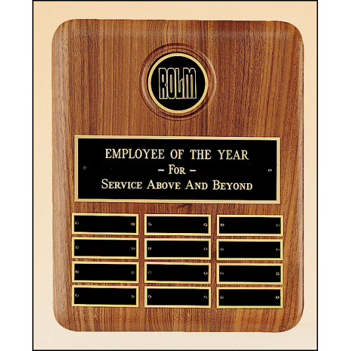 Airflyte solid American walnut perpetual plaque with precision elliptical edge, routed area holds 2-1/2 brass disk. Individually boxed. Individual plates are 7/8 x 2-3/4. Laser engravable plates and disc. Solid brass engraving plate(s). Individually boxed.
