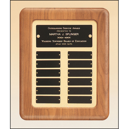 Airflyte solid American walnut perpetual plaque with brushed gold metal back plate and 12 individual black brass plates. Solid brass engraving plate(s). Individually boxed.