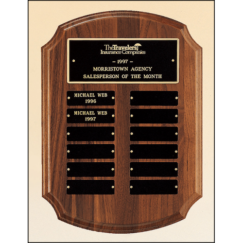 Solid American walnut perpetual plaque with 12 black brass plates. Solid brass engraving plate(s). Individually boxed. Individual plates are 1 x 3-1/4.