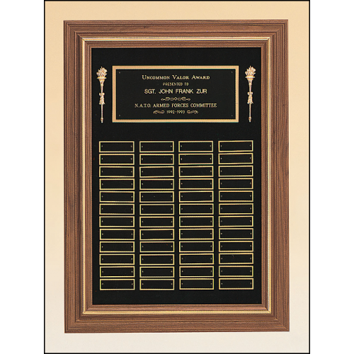 Perpetual plaque with 12 plates and a solid American walnut frame with gold trim. Individual plates are laser engravable. Laser engravable brass engraving plate(s). Individually boxed.