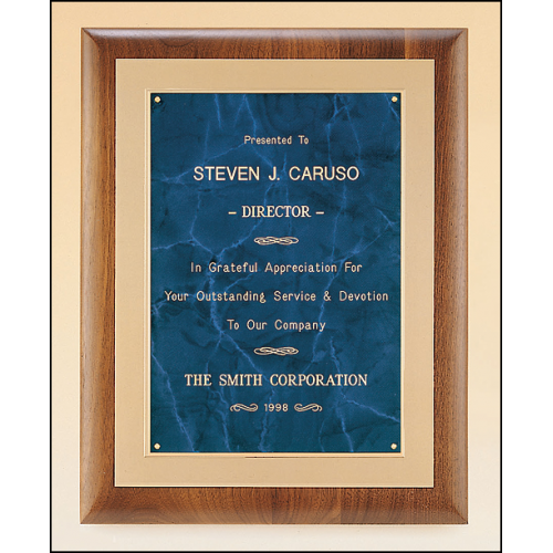 Airflyte solid American walnut plaque with a frost gold back plate with bright gold embossed frame and sapphire marble plate. Laser engravable brass engraving plate. Individually boxed. Plaque plates copyright design: TMC 2008