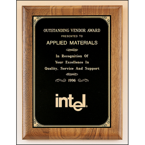 The original and still the best plaque in America. Solid American walnut plaque with a precision elliptical edge and a black or brushed brass plate with printed border. Black brass plates are laser engravable. Individually boxed. Made in USA.