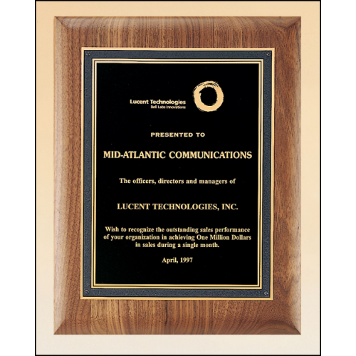 The original and still the best plaque in America. Solid American walnut plaque with a precision elliptical edge and textured black brass plate with black Florentine border. Laser engravable brass plate. Individually boxed. Made in USA.Plaque plates copyright design: TMC 1996