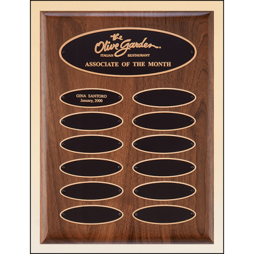 Solid American walnut perpetual plaque with large elliptical black brass plates. Laser engravable brass plate. Made in USA. Individually boxed. Individual plates are 1 x 3-1/4.