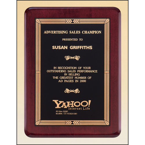 Rosewood stained piano finish wood with a southwestern border design plate. The same production techniques used to give expensive grand pianos their glossy look is available as a recognition award. Over six layers of lacquer are hand applied and polished to create our plaque boards. Laser engravable plate(s). Solid brass engraving plate(s). Individually boxed. Patent pending.