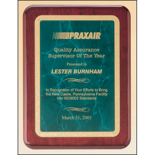 Rosewood stained piano finish plaque with gold Florentine border and marble center. The same production techniques used to give expensive grand pianos their glossy look is available as a recognition award. Over six layers of lacquer are hand applied and polished to create our plaque boards. Laser engravable plate(s). Solid brass engraving plate(s). Individually boxed.