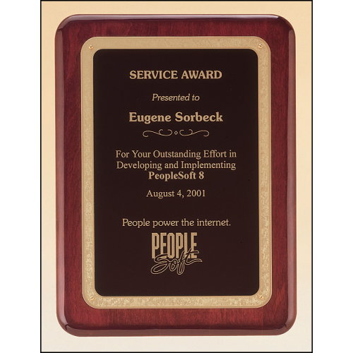 Rosewood stained piano finish plaque with gold Florentine border and black textured center. The same production techniques used to give expensive grand pianos their glossy look is available as a recognition award. Over six layers of lacquer are hand applied and polished to create our plaque boards. Laser engravable plate(s). Solid brass engraving plate(s). Individually boxed.