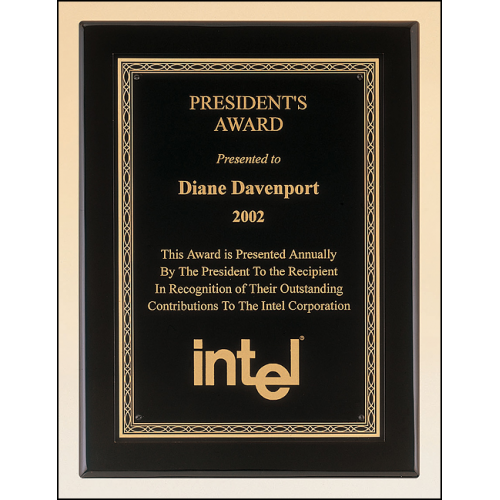 Black stained piano finish plaque with a black brass plate and gold braided design border. The same production techniques used to give expensive grand pianos their glossy look is available as a recognition award. Over six layers of lacquer are hand applied and polished to create our plaque boards. Laser engravable brass plate. Individually boxed.