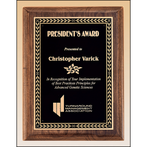 Walnut stained piano finish Airflyte board with leaf design plate. The same production techniques used to give expensive grand pianos their glossy look is available as a recognition award. Over six layers of lacquer are hand applied and polished to create our plaque boards. Laser engravable brass plate. Individually boxed.