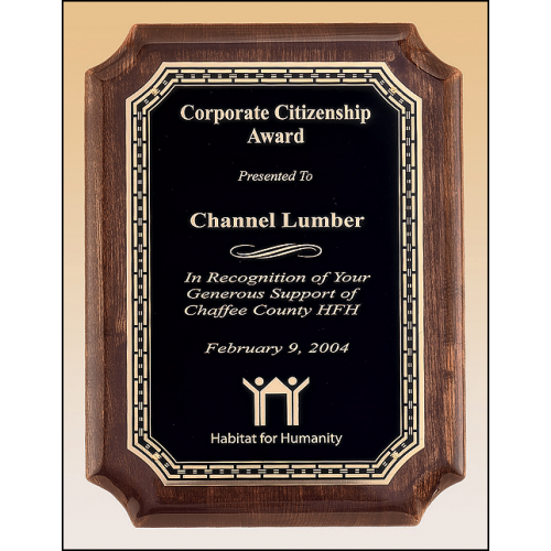 Walnut stained piano finish Airflyte board with link design plate. The same production techniques used to give expensive grand pianos their glossy look is available as a recognition award. Over six layers of lacquer are hand applied and polished to create our plaque boards. Laser engravable brass engraving plate. Individually boxed.