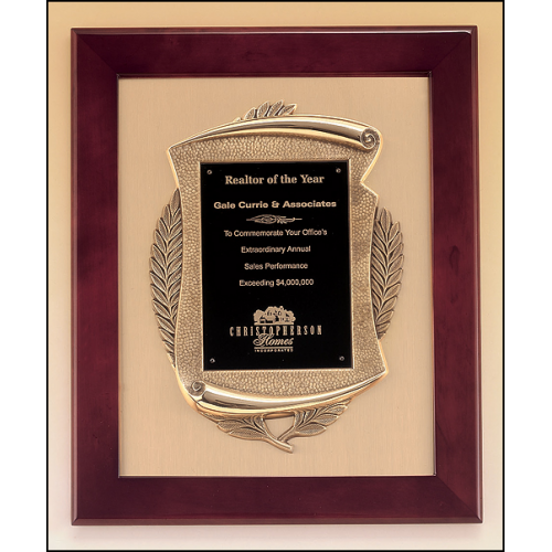 Rosewood stained piano finish Airflyte frame with antique bronze casting on brush gold metal background. The same production techniques used to give expensive grand pianos their glossy look is available as a recognition award. Over six layers of lacquer are hand applied and polished to create our frames. Laser engravable brass plate(s). Individually boxed.