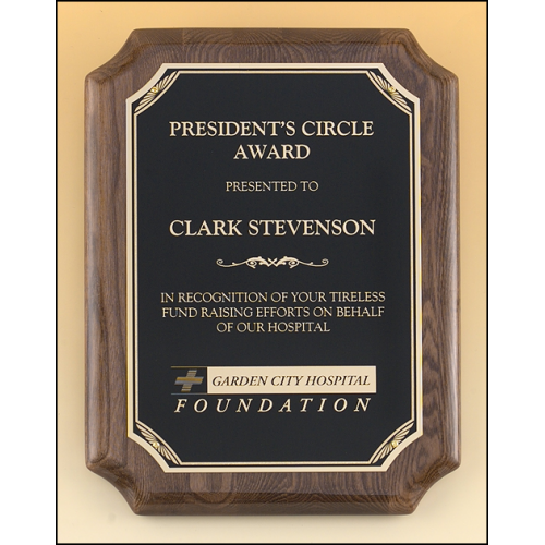 Walnut stained piano finish Airflyte board with sunburst design plate. The same production techniques used to give expensive grand pianos their glossy look is available as a recognition award. Over six layers of lacquer are hand applied and polished to create our plaque boards. Laser engravable brass plate(s). Individually boxed. Plaque plates copyright design: TMC 2004