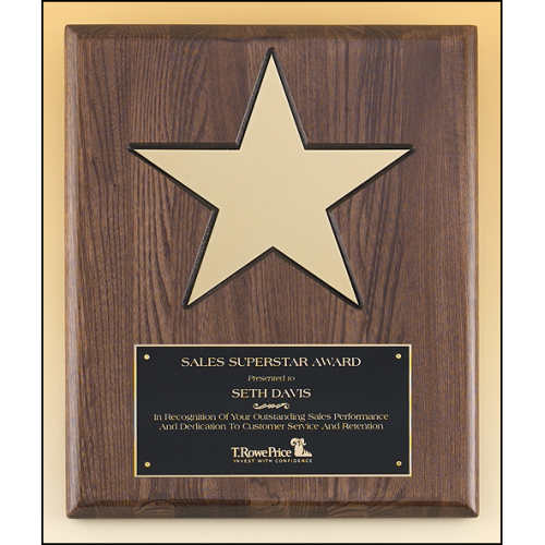 Gold aluminum star (8) on walnut stained piano-finish board with black recessed area. The same production techniques used to give expensive grand pianos their glossy look is available as a recognition award. Over six layers of lacquer are hand applied and polished to create our plaque boards. Laser engravable brass plate(s). Individually boxed.