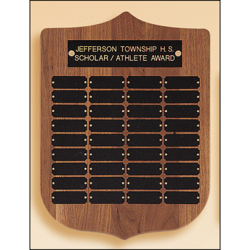 Solid American walnut perpetual plaque, two plate combinations to chose from. Individual plates are 7/8 x 2-1/2. Solid bushed gold brass engraving plate(s). Custom multi-plate plaques available. Call for quote information.