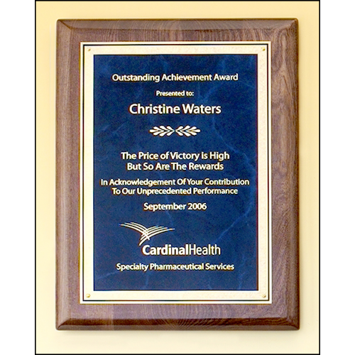 Walnut stained piano-finish Airflyte plaques with sapphire marble center and gold Florentine border engraving plates. The same production techniques used to give expensive grand pianos their glossy look is available as a recognition award. Over six layers of lacquer are hand applied and polished to create our plaque boards. Laser engravable brass plates. Individually boxed.