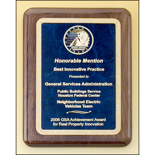 Walnut stained piano-finish Airflyte plaques with sapphire marble center and gold Florentine border engraving plates. The same production techniques used to give expensive grand pianos their glossy look is available as a recognition award. Over six layers of lacquer are hand applied and polished to create our plaque boards. Laser engravable brass plates. Individually boxed.