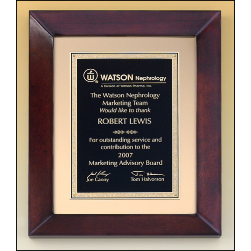 Hand rubbed cherry finish frame plaque with black and gold Florentine plate on brushed metal gold background Laser engravable brass plate(s). Individually boxed.