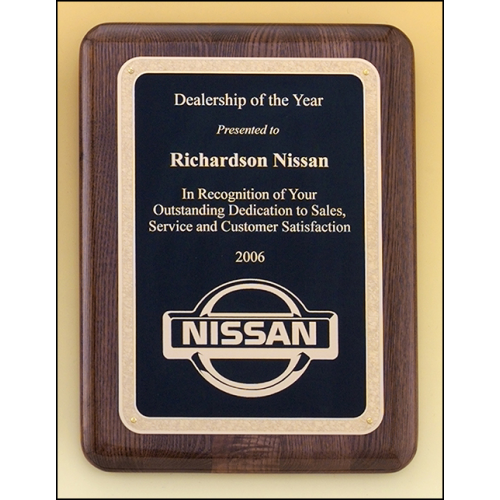 Walnut stained piano-finish Airflyte plaques with black textured center and Florentine border plates. The same production techniques used to give expensive grand pianos their glossy look is available as a recognition award. Over six layers of lacquer are hand applied and polished to create our plaque boards. Laser engravable brass plates. Individually boxed.