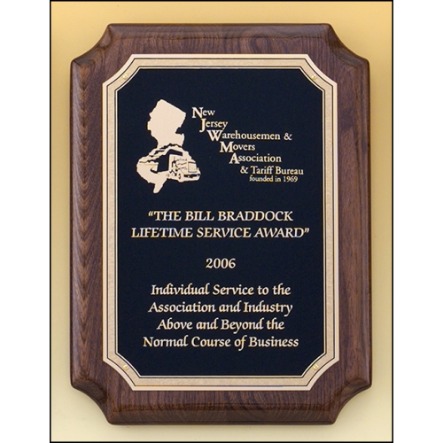 Walnut stained piano-finish Airflyte plaques with black textured center and Florentine border plates. The same production techniques used to give expensive grand pianos their glossy look is available as a recognition award. Over six layers of lacquer are hand applied and polished to create our plaque boards. Laser engravable brass plates. Individually boxed.