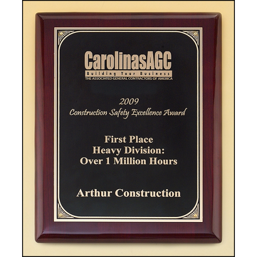 Rosewood stained piano-finished board with gold Florentine leaf design corners engraving plate. The same production techniques used to give expensive grand pianos their glossy look is available as a recognition award. Over six layers of lacquer are hand applied and polished to create our plaque boards. Laser engravable brass plate(s). Individually boxed.
