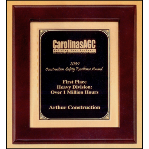 Rosewood stained piano-finished frame with gold Florentine leaf design corners engraving plate. The same production techniques used to give expensive grand pianos their glossy look is available as a recognition award. Over six layers of lacquer are hand applied and polished to create our frames. Laser engravable brass plate(s). Individually boxed.