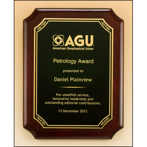 Rosewood piano-finish plaque featuring a gold florentine border with textured black center engraving plate. LaserFX plate suitable for laser engraving. Individually boxed.