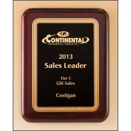 Rosewood piano-finish plaque featuring a gold florentine border with textured black center engraving plate. Laser engravable plate(s). Individually boxed. LaserFX plate is brass-plated steel, we recommend laser engraving only.