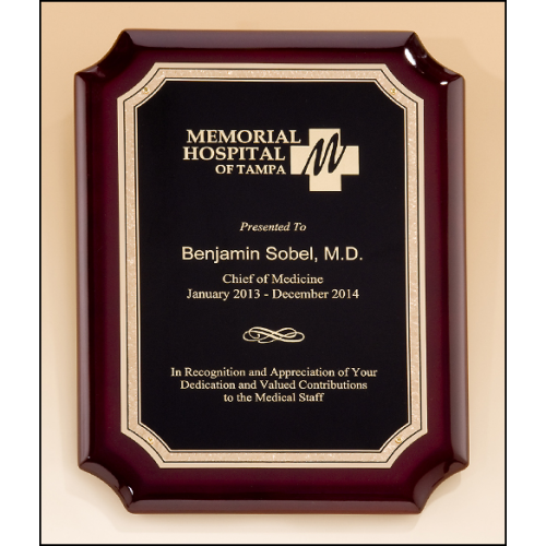 High gloss rosewood stained plaque with gold florentine border plate. Laser engravable plate. Individually boxed. LaserFX plate is brass-plated steel, we recommend laser engraving only.