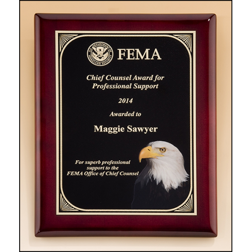 Rosewood piano-finish plaque with high definition eagle head graphic. Laser engravable plate. Individually boxed. LaserFX plate is brass-plated steel, we recommend laser engraving only.