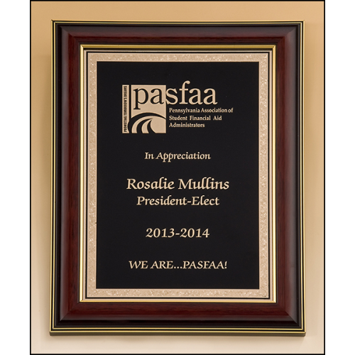High gloss mahogany stained frame with gold florentine border plate. Laser engravable plate. Individually boxed. Made in USA. LaserFX plate is brass-plated steel, we recommend laser engraving only.