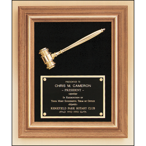 American walnut frame with gold trim, gold electroplated metal gavel on maroon background. Laser engravable brass plate(s). Individually boxed.