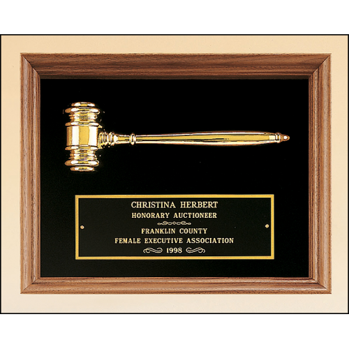 American walnut frame with a gold electroplated metal gavel on maroon velour background. Laser engravable brass plate(s). Individually boxed.