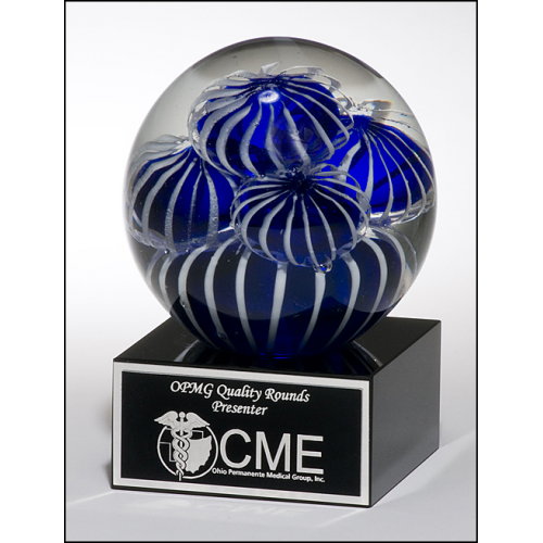 Art glass globe with blue and white sea anemone design on black glass base. Laser engravable aluminum plate. These glass awards are packaged in satin-lined, padded gift boxes. Each piece of art glass is made by hand, air bubbles and color variations are common.