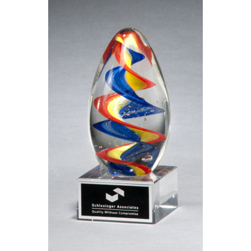 Colorful egg-shaped art glass award with clear glass base. Laser engravable aluminum plate. These glass awards are packaged in satin-lined, padded gift boxes. Each piece of art glass is made by hand, air bubbles and color variations are common.