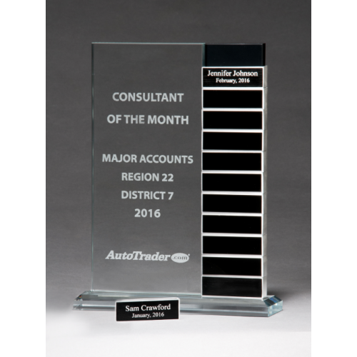 Jade glass award with 12 individual aluminum blocks. Perfect for monthly recognition or milestone awards. Aluminum blocks are x 2 with black silk screened fronts. These Glass Awards are packaged in satin-lined, padded gift boxes.