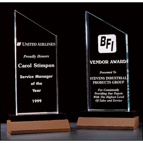 3/4 thick clear acrylic upright on black acrylic pedestal and solid walnut base. Presentation boxes not included. A3107 engrav. area size: 3 x 6 A3109 engrav. area size: 3-1/4 x 8 A3111 engrav. area size: 3-1/2 x 10