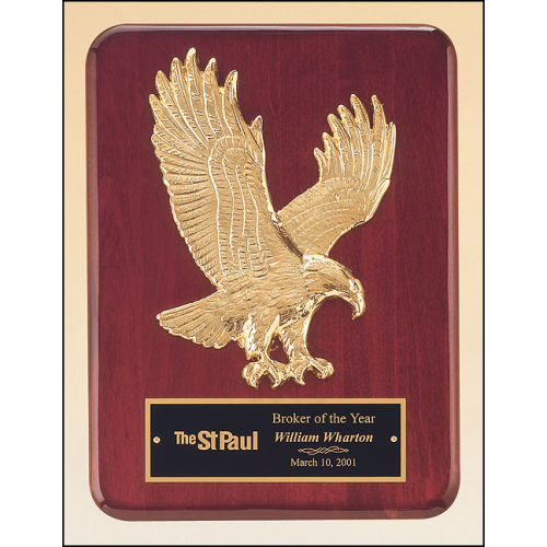Rosewood stained piano finish Airflyte plaque with goldtone finish sculptured relief eagle casting. The same production techniques used to give expensive grand pianos their glossy look is available as a recognition award. Over six layers of lacquer are hand applied and polished to create our plaque boards. Laser engravable plate(s). Individually boxed.